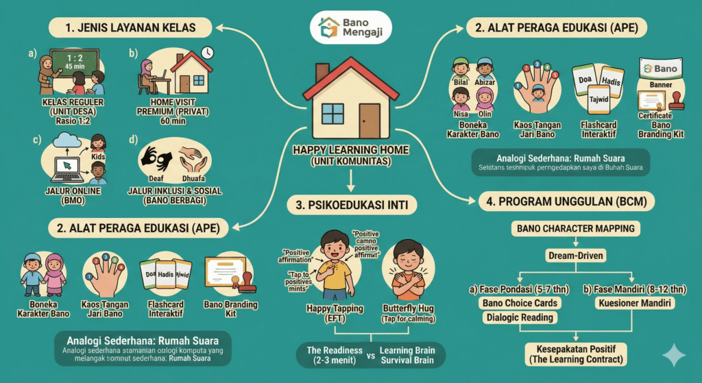 Untuk mewujudkan visi transformasi pendidikan Al-Qur’an yang holistik, Metode Jari Bano (MJB) tidak hanya berhenti pada teori. Kami mengimplementasikan metode ini secara nyata melalui unit-unit kecil berbasis komunitas yang hangat dan dekat dengan Anda, yang kami sebut Happy Learning Home.